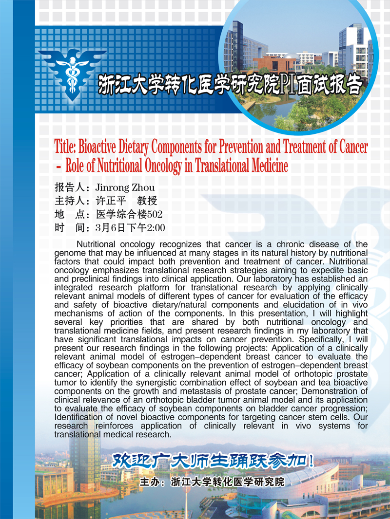 Jirong Zhou教授:Bioactive Dietary Components for Prevention and Treatment of Cancer – Role of Nutritio